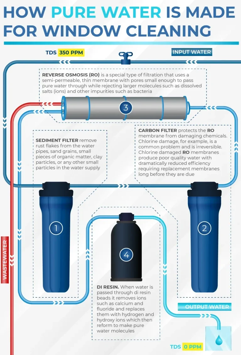 Benefits of Pure Water: Using pure water for window cleaning offers several advantages. Firstly, since it is free from minerals and impurities, pure water does not leave behind residue or streaks on windows, providing a spotless finish. Secondly, its chemical-free nature makes it environmentally friendly and safe for use on various surfaces. Lastly, pure water has a natural affinity for dirt and grime, allowing it to effortlessly dissolve and wash away even the most stubborn stains.